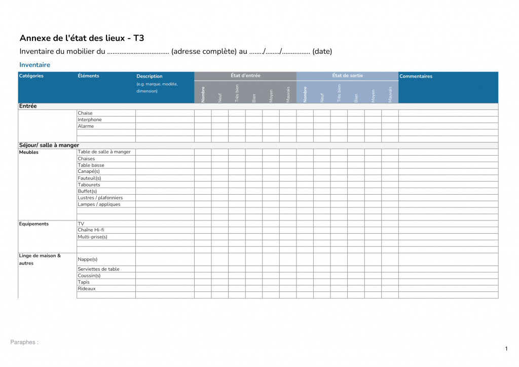 L’inventaire doit être effectué au début de la location, avant l’entrée du locataire dans le logement. Il est important de le faire en présence du locataire afin qu’il puisse vérifier et confirmer l’exactitude des informations.