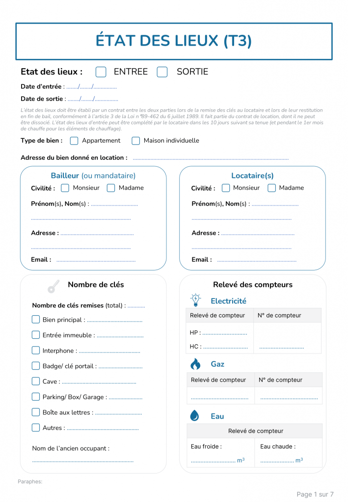 - Le type d’état des lieux (entrée ou sortie) ;